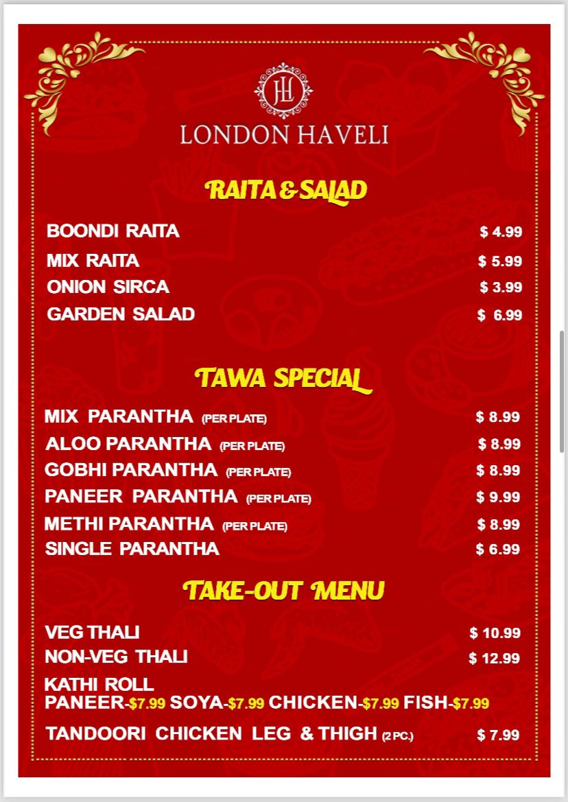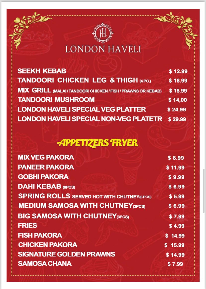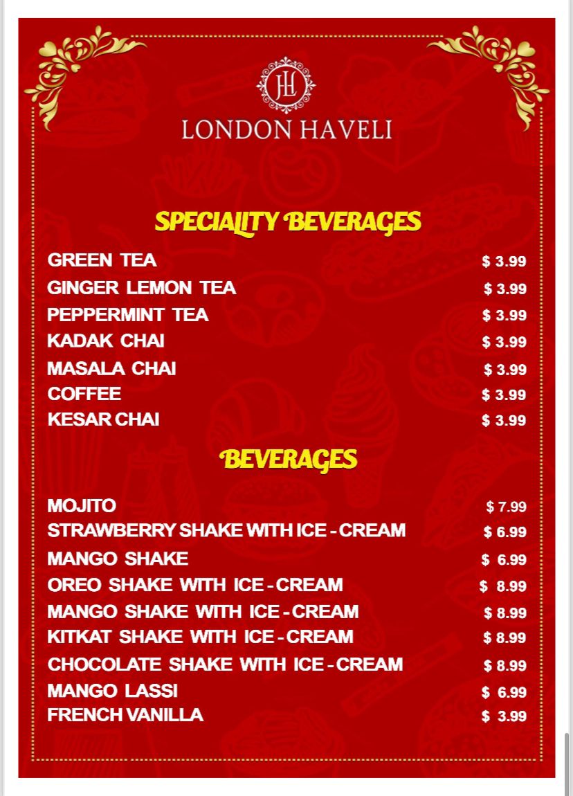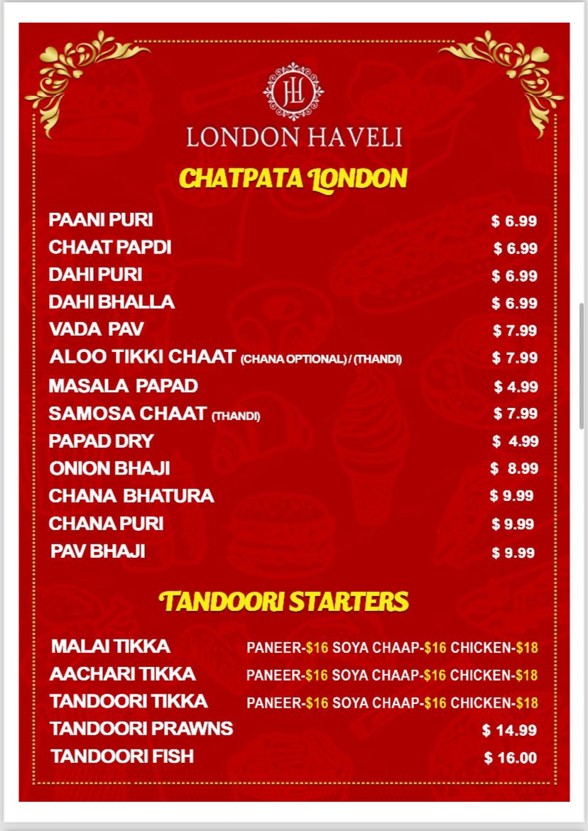 Welcome to London Haveli, where we invite you to embark on a culinary journey through the vibrant and rich flavors of Indian cuisine! Nestled at 795 Wonderland Rd S C2, London, ON, our menu is a celebration of bold spices and fresh ingredients, featuring a delightful array of specialties that will tantalize your taste buds. Don't miss our luscious Paneer Butter Masala paired with the warmth of Delhi Style Butter Naan, or indulge in the succulent Tandoori Chicken Leg & Thigh for a truly authentic experience. For those craving something crispy, our Chicken Pakora and Dahi Tikki are irresistible starters, while the Goat Curry and Lamb Biryani promise to transport you straight to the heart of India. To top off your meal, treat yourself to our Hot Sizzlers Brownies with Ice Cream or sip on a refreshing Pineapple Mojito. Whether you're sharing plates of Paani Puri with friends or enjoying a Kit Kat Shake with Ice Cream, every bite at London Haveli is an invitation to savor the extraordinary. Come and experience our captivating London Haveli Menu today!