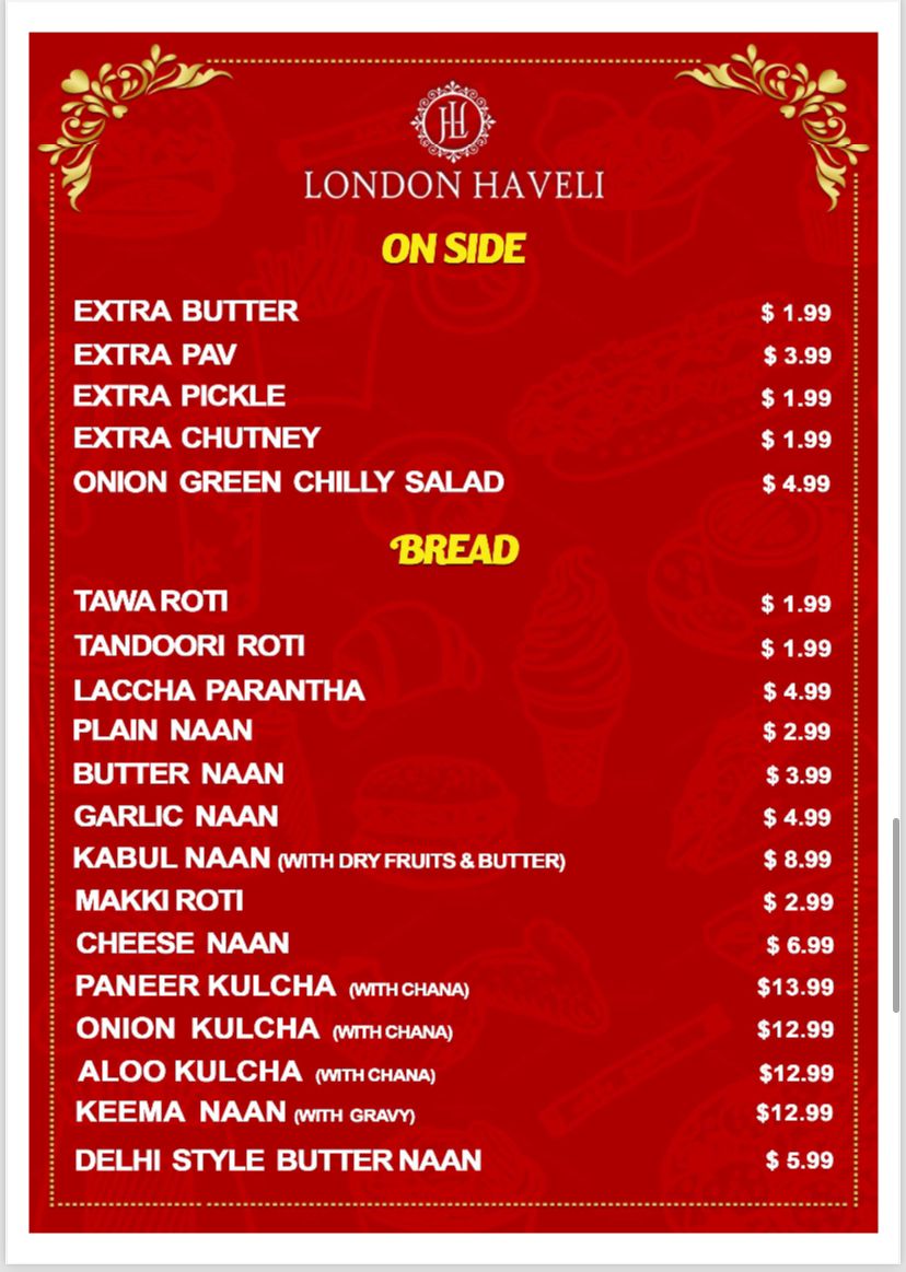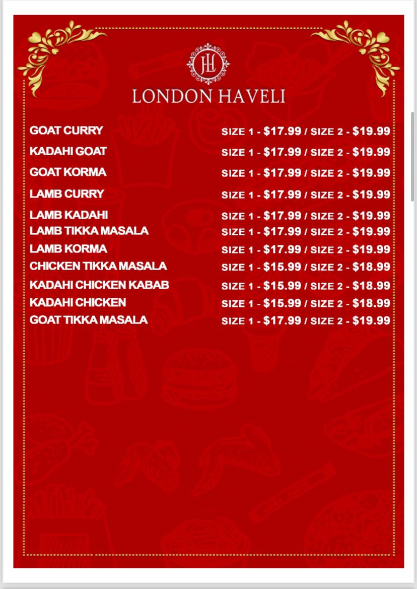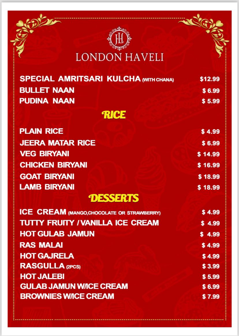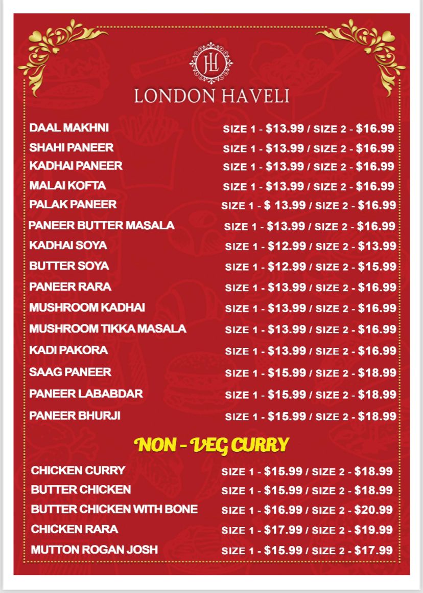 Welcome to London Haveli, where we invite you to embark on a culinary journey through the vibrant and rich flavors of Indian cuisine! Nestled at 795 Wonderland Rd S C2, London, ON, our menu is a celebration of bold spices and fresh ingredients, featuring a delightful array of specialties that will tantalize your taste buds. Don't miss our luscious Paneer Butter Masala paired with the warmth of Delhi Style Butter Naan, or indulge in the succulent Tandoori Chicken Leg & Thigh for a truly authentic experience. For those craving something crispy, our Chicken Pakora and Dahi Tikki are irresistible starters, while the Goat Curry and Lamb Biryani promise to transport you straight to the heart of India. To top off your meal, treat yourself to our Hot Sizzlers Brownies with Ice Cream or sip on a refreshing Pineapple Mojito. Whether you're sharing plates of Paani Puri with friends or enjoying a Kit Kat Shake with Ice Cream, every bite at London Haveli is an invitation to savor the extraordinary. Come and experience our captivating London Haveli Menu today!